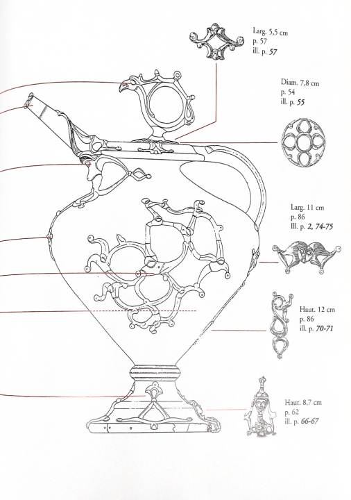Dès sa découverte, l’archéologue Hucke identifie une cruche en bois, dont il ne reste que les éléments métalliques décoratifs. Le support organique, probablement en if — essence sacrée du monde celtique — n’a pas survécu. Plusieurs reconstitutions se succèdent : en 1953, en 1958, puis en 1992 par Peskar, qui livre la version aujourd’hui exposée au Musée morave de Brno. Bien que certaines pièces aient pu être replacées arbitrairement, l’ensemble apparaît fidèle à l’objet d’origine. Datée vers 285-280 av. J.-C., la cruche se rattache à une période charnière de l’art celtique, marquée par un brassage intense de motifs méditerranéens et d’innovations locales.