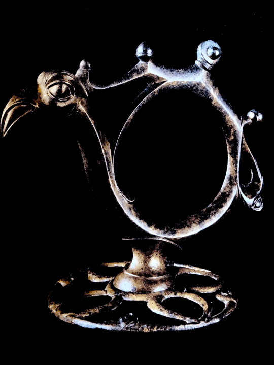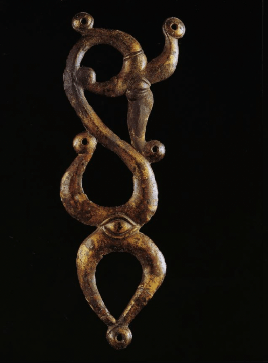 - Les dragons du couvercle : un monstre hybride au corps serpentin et à la tête de griffon, inspiré du ketos marin du monde hellénistique, témoigne de contacts méditerranéens. Sa duplication inversée renforce l’ambiguïté visuelle.