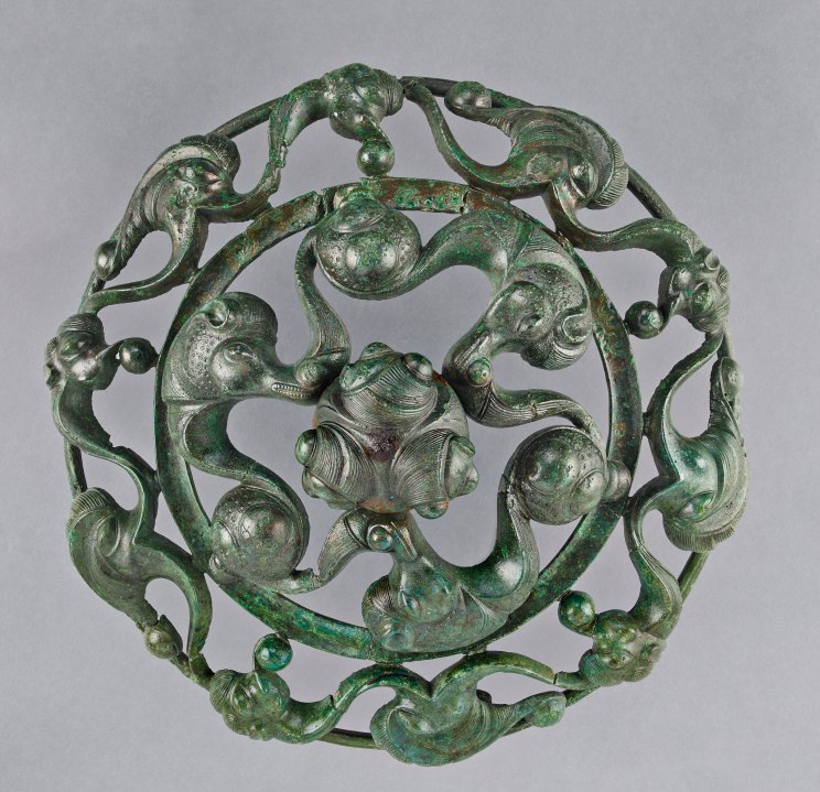 Cet objet en bronze, de plus de 20 centimètres de diamètre, a été mis au jour lors de fouilles sur le site de l’aéroport Roissy-Charles-de-Gaulle. Associé à une applique zoomorphe ailée fixée sur un support en bois, il a été retrouvé dans une tombe à char, mais sans armes. Cette absence intrigue les chercheurs : elle laisse penser que le défunt n’était pas un guerrier, mais peut-être un druide, personnage central de la société celte, à la fois prêtre, savant et dépositaire du savoir.