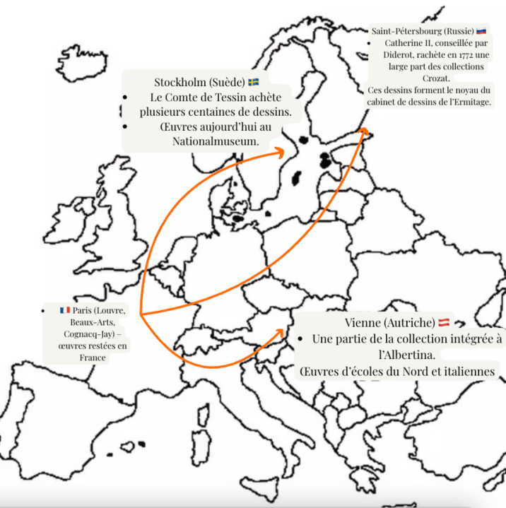 Paradoxalement, cette dissémination contribua à la survie du cabinet. Le comte de Tessin emporta plusieurs centaines de dessins en Suède, aujourd’hui conservés au Nationalmuseum de Stockholm ; d’autres rejoignirent l’Albertina de Vienne ; et en 1772, Catherine II, sur les conseils de Diderot, racheta une grande partie des collections Crozat pour le futur Ermitage de Saint-Pétersbourg. Les musées européens sont ainsi devenus, sans le savoir, les héritiers d’un même regard.