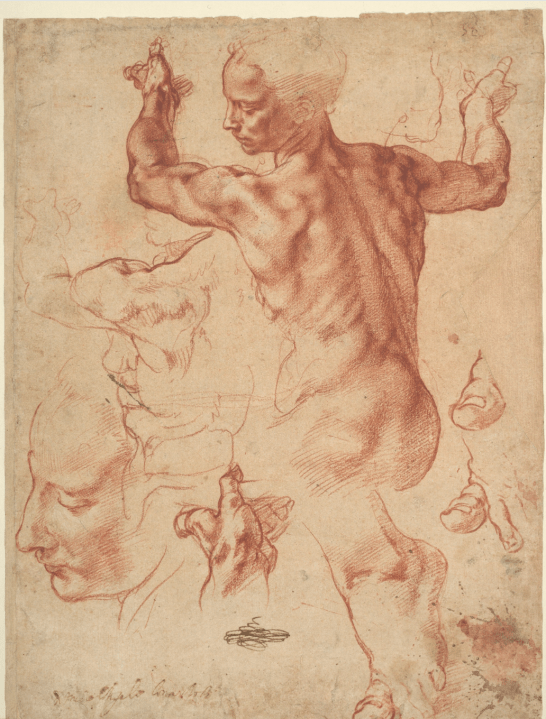 Au fil du chantier de la Sixtine, Michel-Ange varie ses outils : la sanguine s’impose progressivement pour les études de figure, notamment d’après modèle vivant. Elle permet une ligne nerveuse, des renforcements, des reprises, mais elle pardonne peu : difficile d’effacer, difficile de tricher. C’est précisément cette exigence qui rend ces feuilles si “présentes”, si physiques.